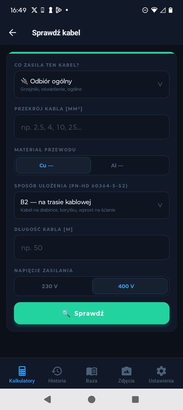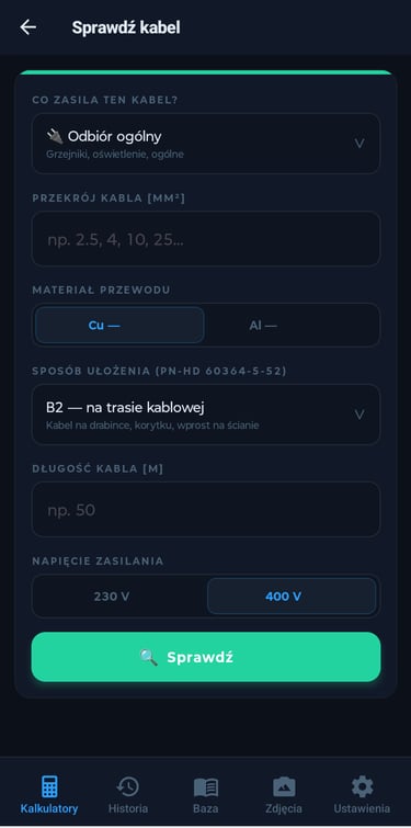 Opis: Główny kalkulator do projektowania instalacji elektrycznych. Na podstawie mocy odbiornika, napięcia, długości trasy i sposobu ułożenia kabla — oblicza minimalny przekrój przewodu (Cu lub Al), dobiera zabezpieczenie nadprądowe i sprawdza czy spadek napięcia mieści się w normowych granicach.
