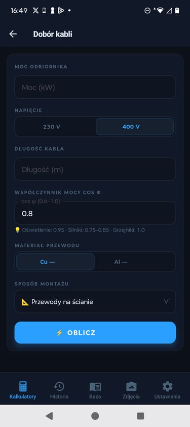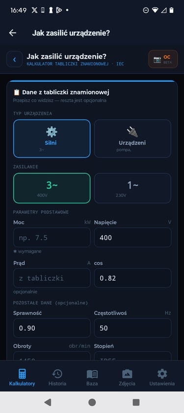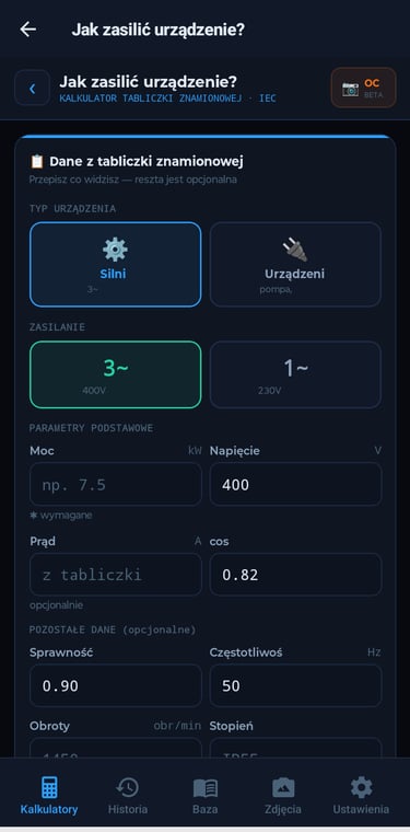 Opis: Narzędzie do doboru zasilania urządzenia lub silnika. Możesz zeskanować tabliczkę znamionową aparatem (OCR automatycznie wypełni pola) lub wpisać dane ręcznie. Na tej podstawie aplikacja dobiera kabel zasilający i zabezpieczenie nadprądowe.