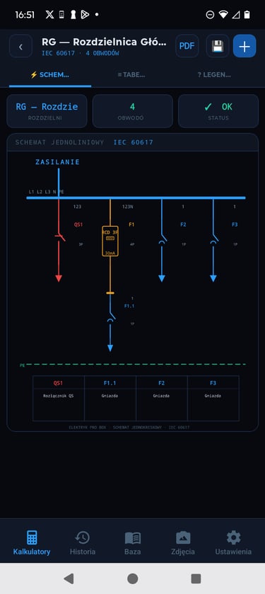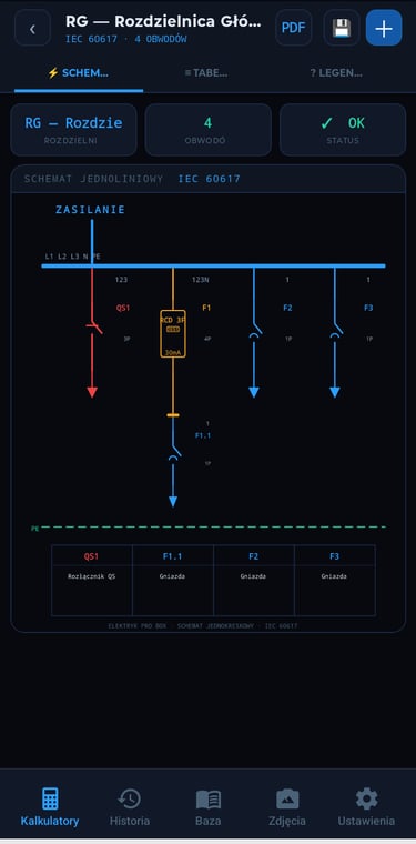 Opis: Edytor schematów jednoliniowych rozdzielnic elektrycznych zgodny z IEC 60617. Układ pionowy jak w profesjonalnej dokumentacji: zasilanie z góry, szyna zbiorcza, elementy w kolumnach w dół. 28 typów elementów w 8 kategoriach: wyłączniki, RCD, SPD, styczniki, przekaźniki, zegary, lampki, listwy zaciskowe. PDF ze stopką firmową i tabelą opisową.