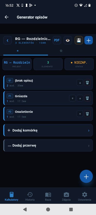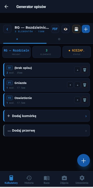 Opis: Narzędzie do generowania opisów tabliczek rozdzielnicy, oznaczeń i nazw obwodów. Tworzysz listę komórek (każda z oznaczeniem i opisem), ustawiasz szerokości modułów i eksportujesz do PDF. Idealne do opisywania RG, RP i tablic mieszkaniowych.