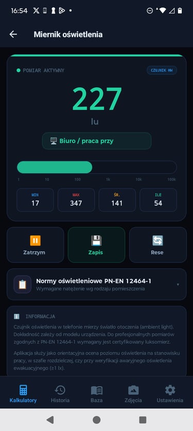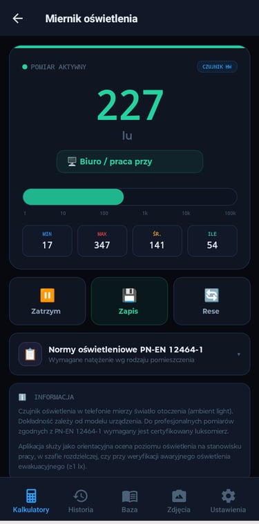 Opis: Luksomierz wykorzystujący czujnik światła w telefonie. Odczyt natężenia oświetlenia w czasie rzeczywistym z klasyfikacją wg normy PN-EN 12464-1:2021. Funkcja HOLD (zamrożenie odczytu), statystyki sesji (MIN/MAX/ŚREDNIA) i tabela wymaganych wartości dla różnych pomieszczeń.