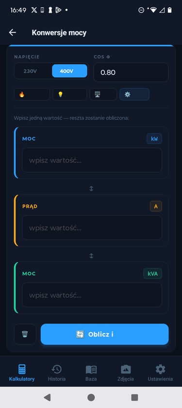 Opis: Szybki kalkulator do przeliczania między mocą czynną (kW), prądem (A) i mocą pozorną (kVA). Wpisz dowolną jedną wartość — reszta zostaje obliczona automatycznie. Działa dla sieci 1-fazowej 230V i 3-fazowej 400V z uwzględnieniem współczynnika mocy cos φ.